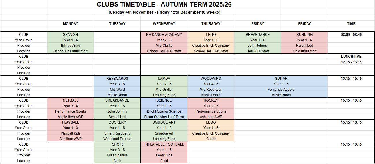 Science with Bright Sparks Science on Wednesdays (Y1 - 6) [CANCELLED - Insufficent sign-ups]: This 6 week course will start after October half term. Please see the attached flyer for details of how to book. Please note this club will not run if insufficient sign-ups are received. A decision will be made when we return from half term on Tuesday 4th November. If this club is cancelled due to insufficient sign-ups all those that have applied will be refunded in full.