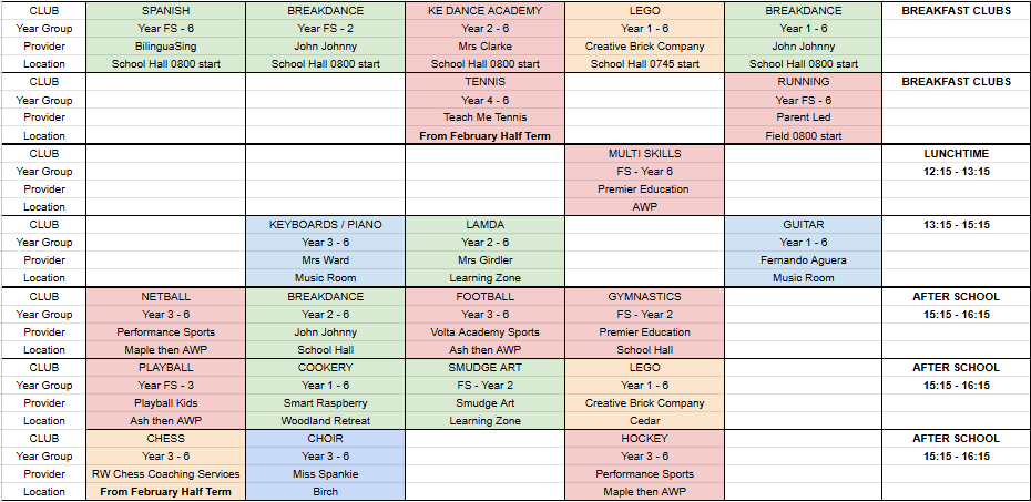 Multi-Skills Lunchtime Clubs on Thursday with Premier Education (FS - Y6): Each club will run for 30 minutes. A Junior club (for years 3 - 6) will start at 12.15pm after which they will have time to have lunch. An Infant club (for Foundation Stage to Year 2) will start after they've eaten their lunch at 12.45pm.